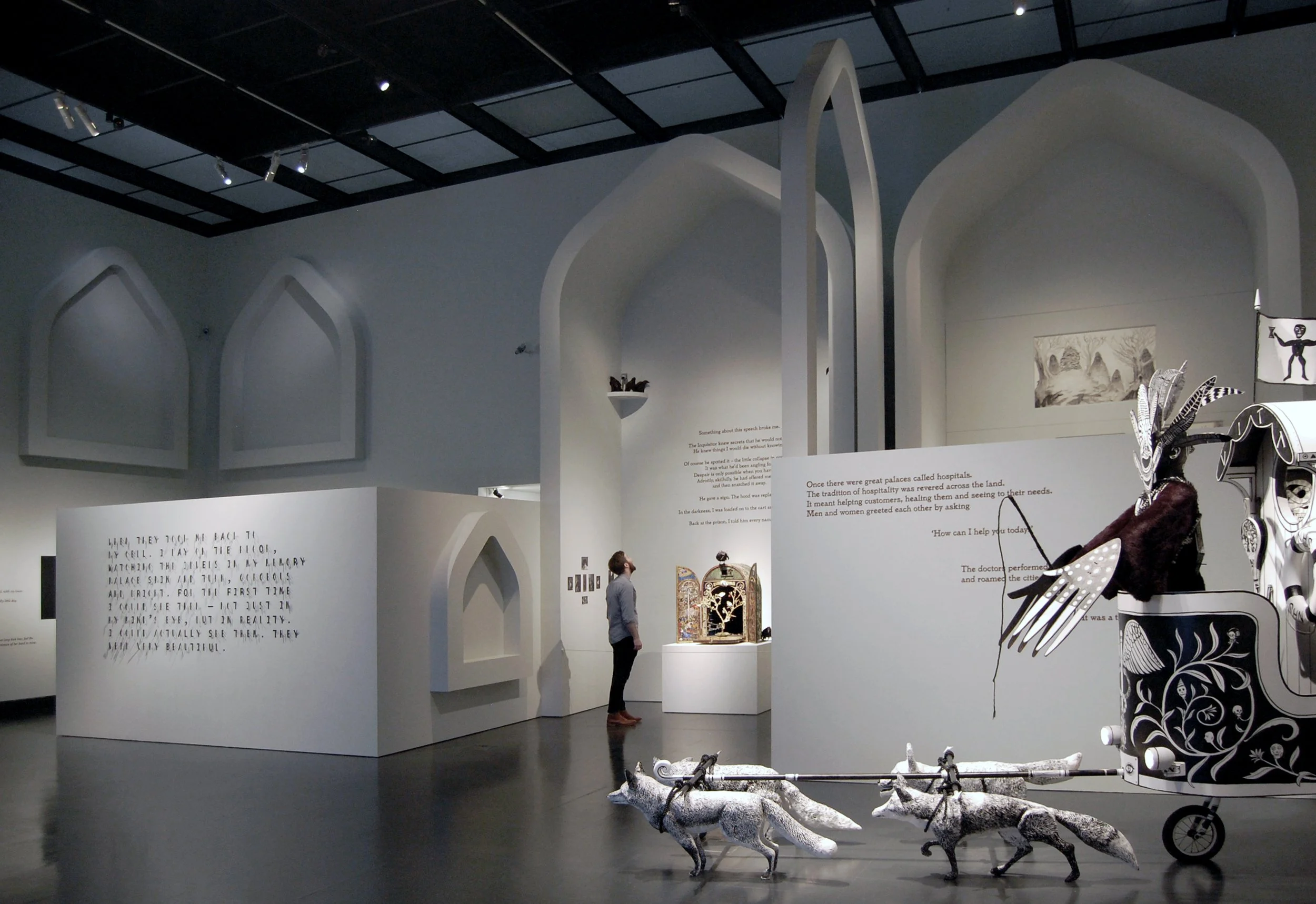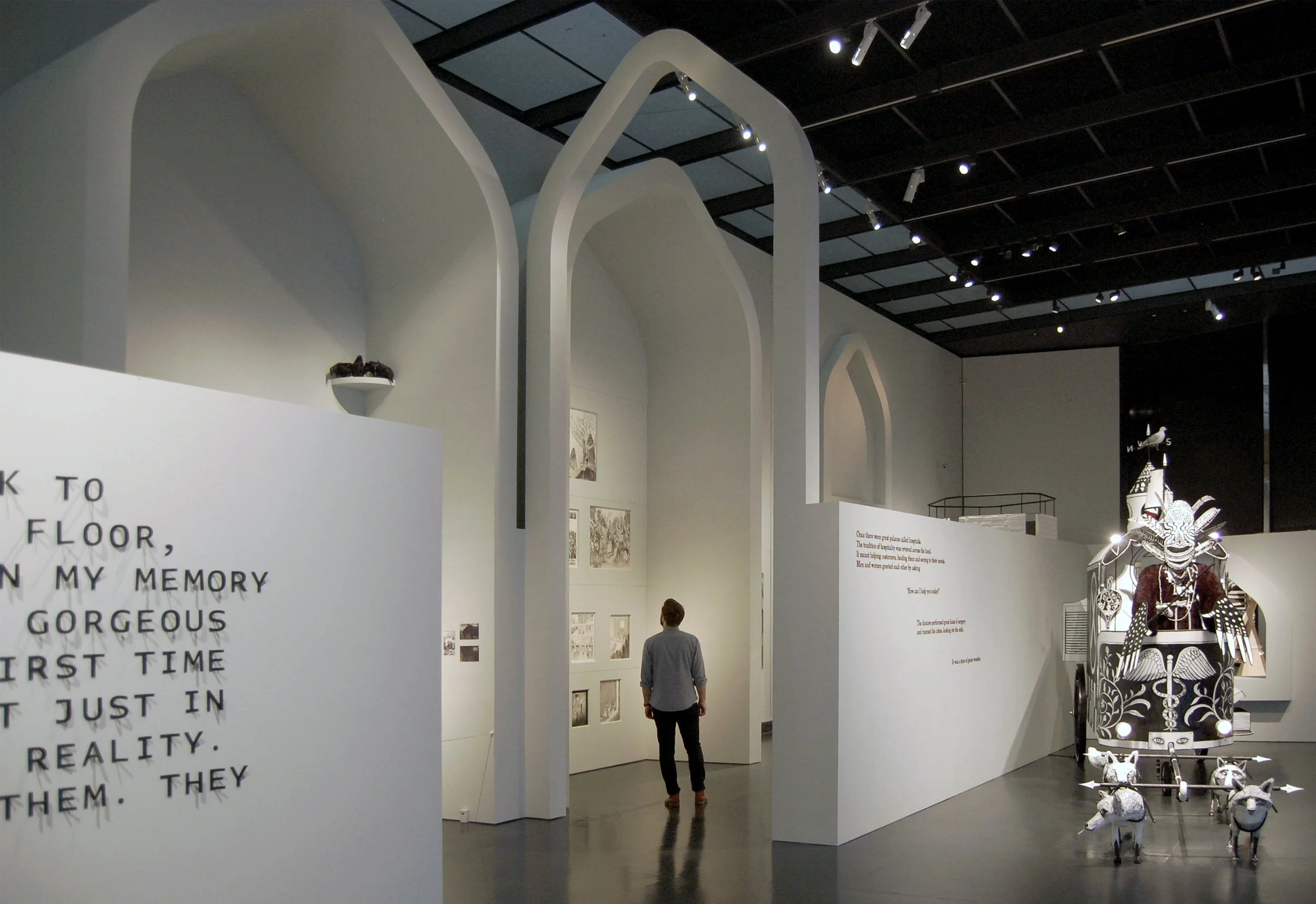 In a collaboration between Sky Arts : Ignition and the Victoria & Albert Museum in London, FleaFolly designed a ‘Palace of Memories’ to house the works of 20 different artists, typographers, illustrators and graphic designers who each responded to an original piece of fiction by author Hari Kunzru. Grand arches, representing the last vestiges of a dystopian vision of London surround the viewer to create a multidimensional set of spaces that spatialise Kunzru’s text. FleaFolly were responsible for developing the design, creating construction drawings and tender packages whilst working closely and in collaboration with the Victoria & Albert Museum, the numerous artists involved and the various contractors and sub-contractors across all stages of the project.